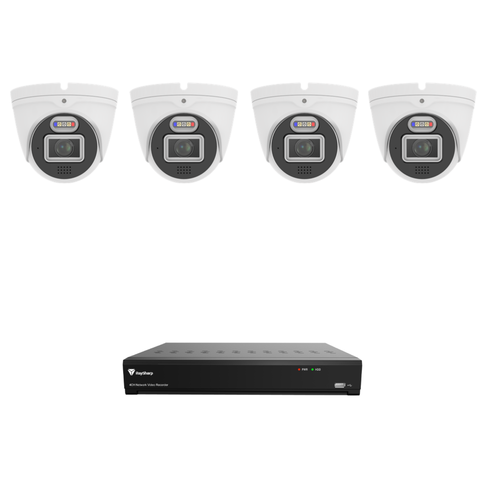Raysharp RS8MPIPCCTVKIT3 4K 8MP IP CCTV Kit # 3 with 1 * RS-N2208HR-PR-E 8-CH NVR (without HDD) + 4 * RS-CH340N4MIG-HALTF-LFW28PW 4K 8MP All-in-One IP Turret Cameras