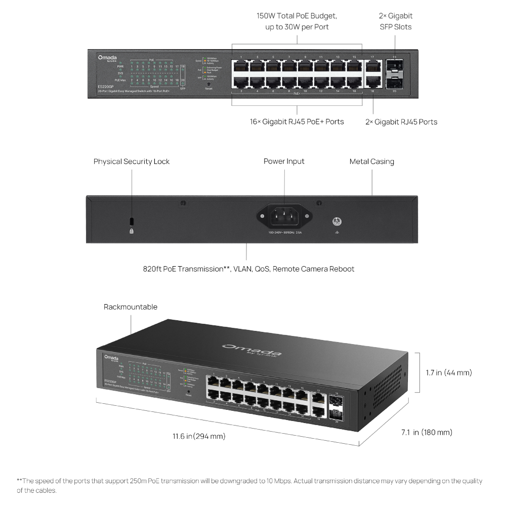TP-Link Omada ES220GP 20-Port Gigabit Ethernet Easy Managed Fanless Network Switch with 16 * GbE PoE+ Ports + 2 * GbE LAN Ports + 2 * SFP Slots – 150w PoE Power Output – Centralized Cloud Management Via Web OR Omada App