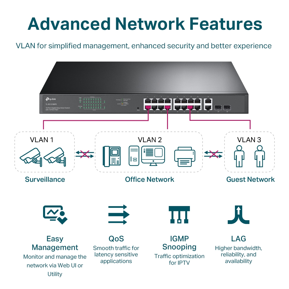 TP-Link TL-SG1218MPE Jetstream 16-Port Gigabit Ethernet Easy Smart Network PoE Switch with 16 * GbE PoE+ Ports + 2 * GbE LAN Ports + 2 * Combo SFP Slots – 250w PoE Power Output – Web-Management