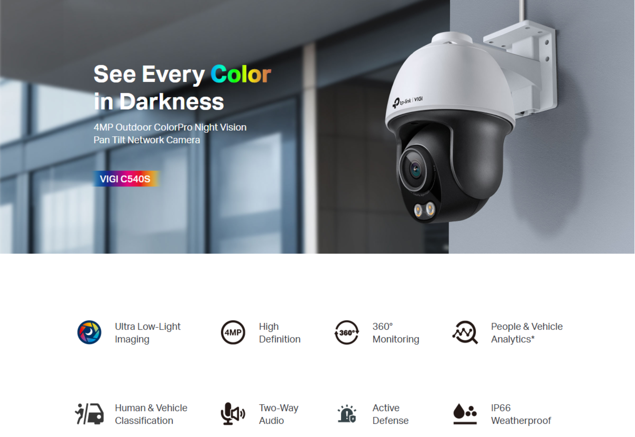 TP-Link VIGI C540S EasyCam VIGI ColorPro 4MP AI Smart-Dual-Light (30m IR + 30m White-Light) Full-Colour Ultra-Low-Light PoE IP Weatherproof PT (Pan + Tilt) Auto-Tracking Camera with 4mm Fixed Lens – 2-Way Audio + Active-Deterrence
