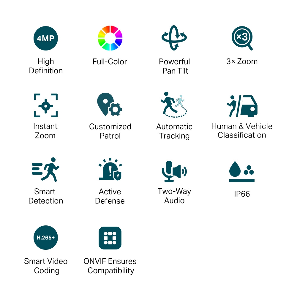 - Active Defense: Warn potential intruders instantly with sound and light when abnormal events.