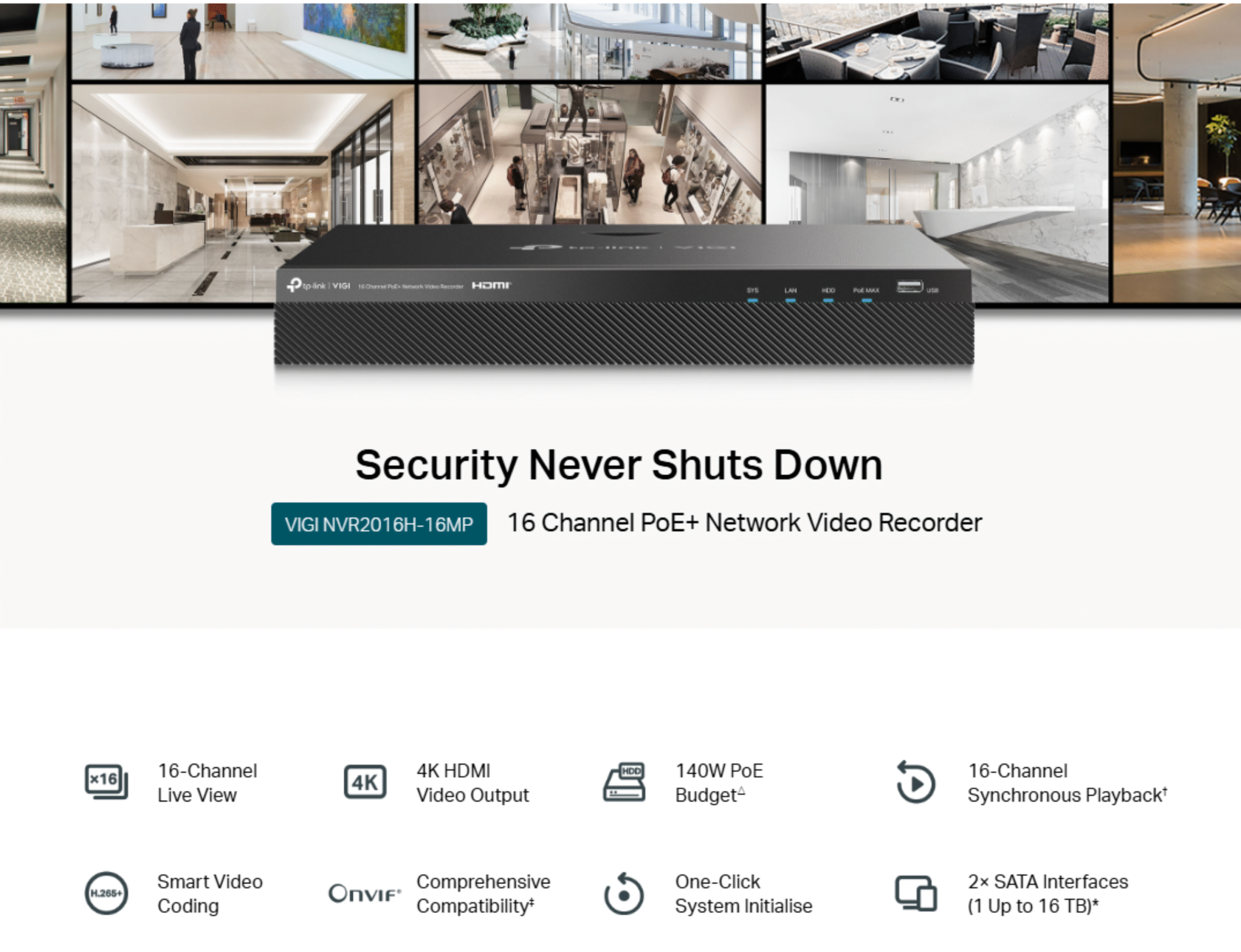 TP-Link VIGI NVR2016H-16MP 4K 1U 16-Channel 16* PoE NVR – Without HDD